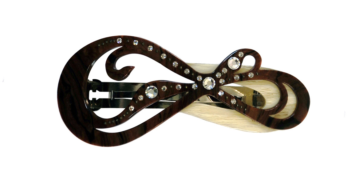 The Deco barette was designed for Mimco along side the Deco headband. The Deco barette is constructed from French acetate and Swarovski crystals.